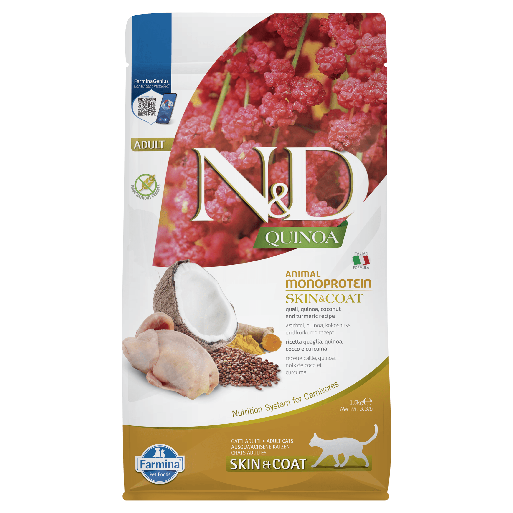 Farmina N&D Quinoa Skin & Coat is a complete dietetic food for cats, suggested for the reduction of ingredient and nutrient intolerances